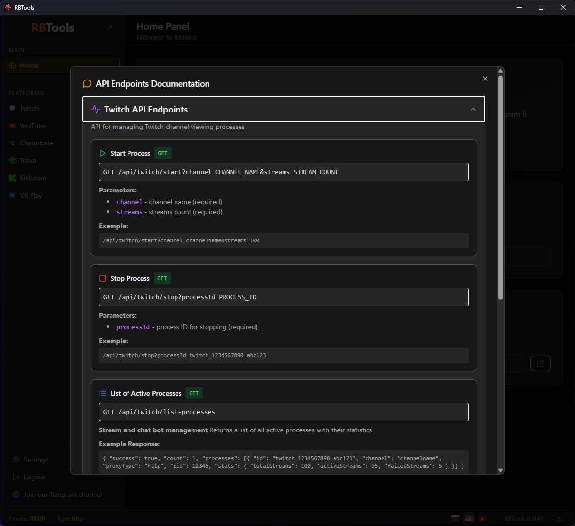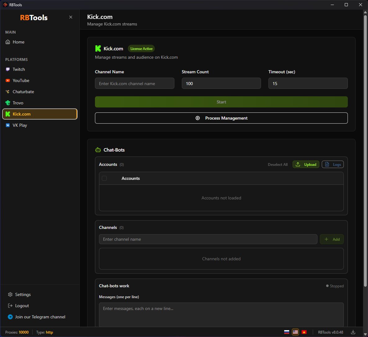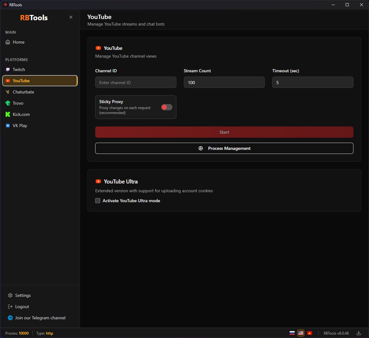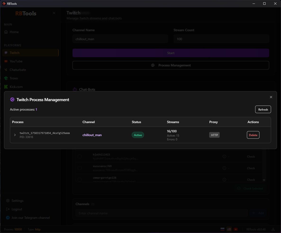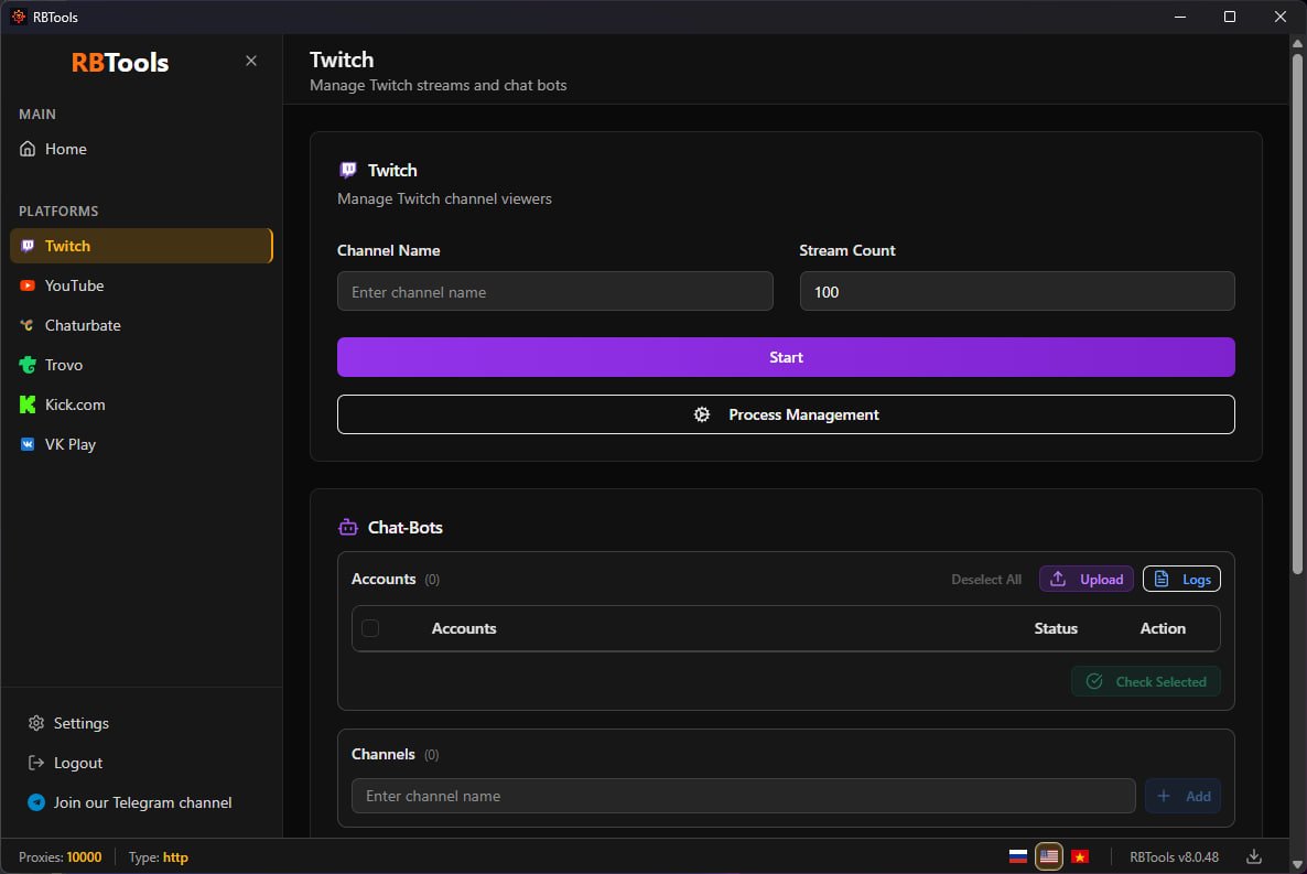 Comprehensive solution for viewbotting on Twitch, YouTube, VK Play, Kick.com, Chaturbate, TROVO.