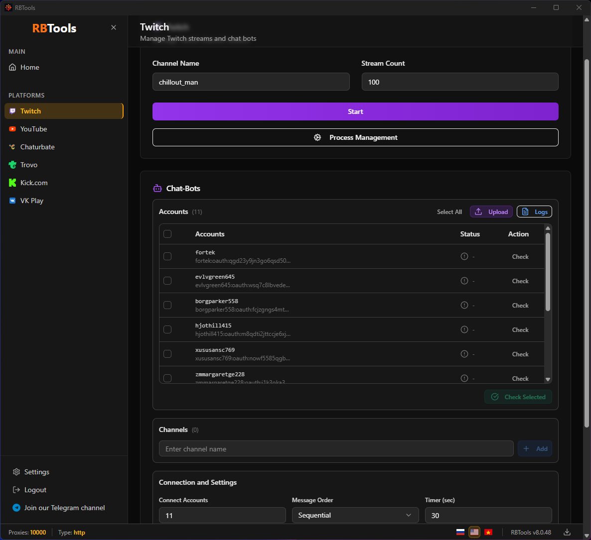 Support HTTP(s), SOCKS4, SOCKS5 proxies. Use in multiple processes. Stream tracking on online offline, auto off / on cheat on the channel. Import proxy from URL with auto-update feature.. Quick import service proxies at the click of a button (for service proxy subscribers). Chat bots for Twitch. YOUTUBE viewbotting