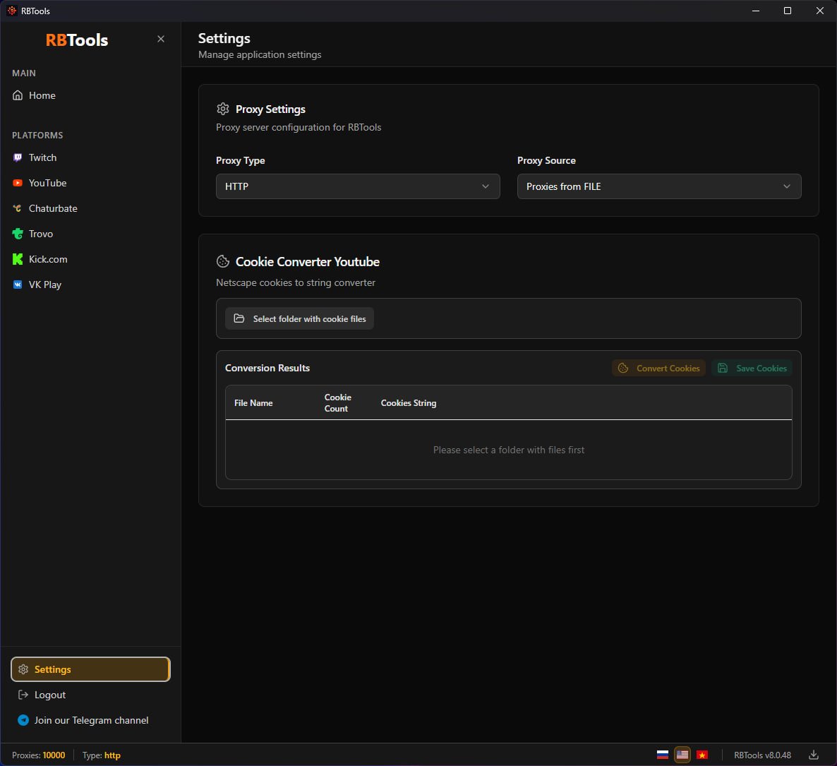 Support HTTP(s), SOCKS4, SOCKS5 proxies. Use in multiple windows. Import proxy from URL with auto-update feature. Chat bots support. VKPlay viewbotting